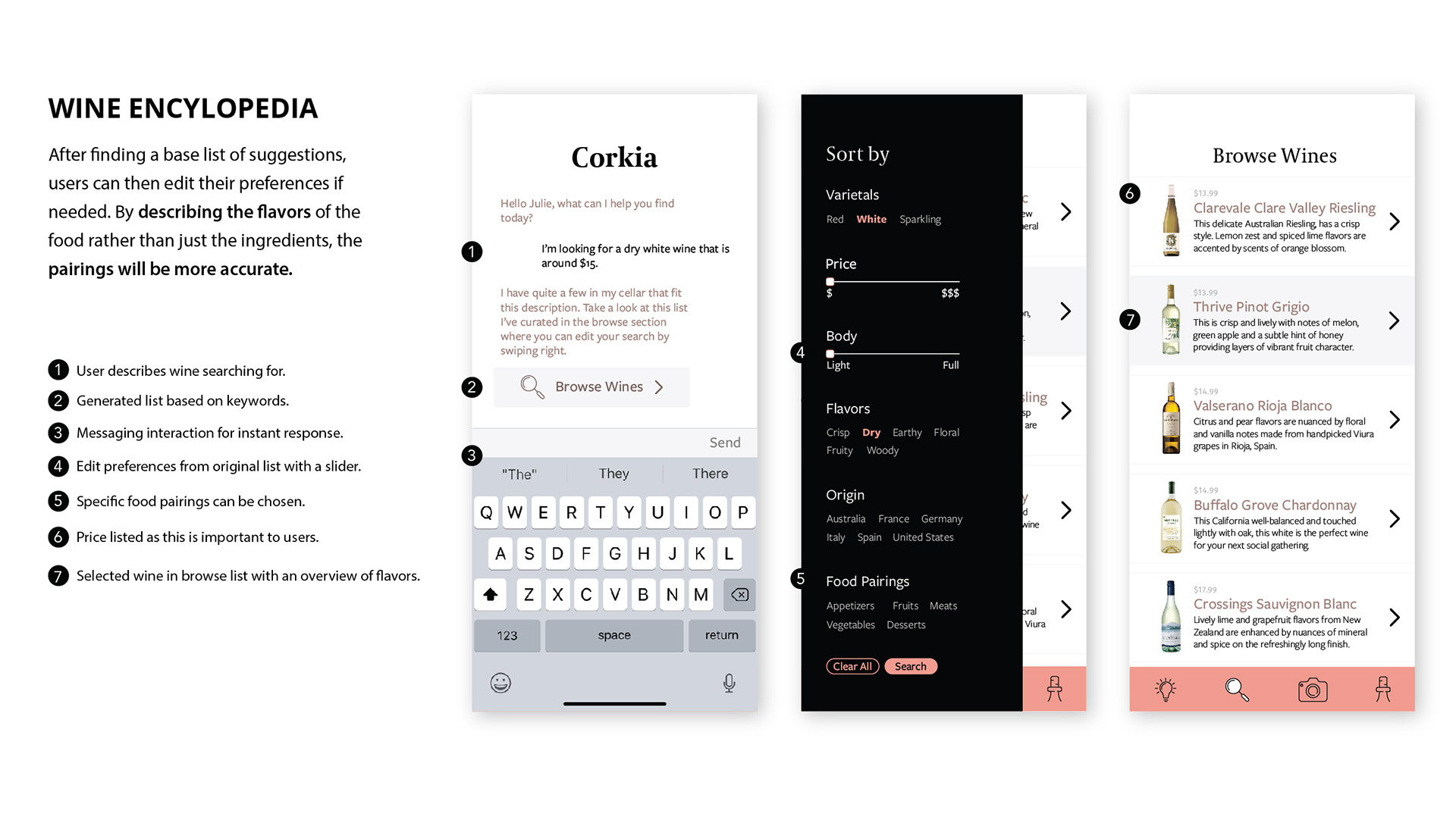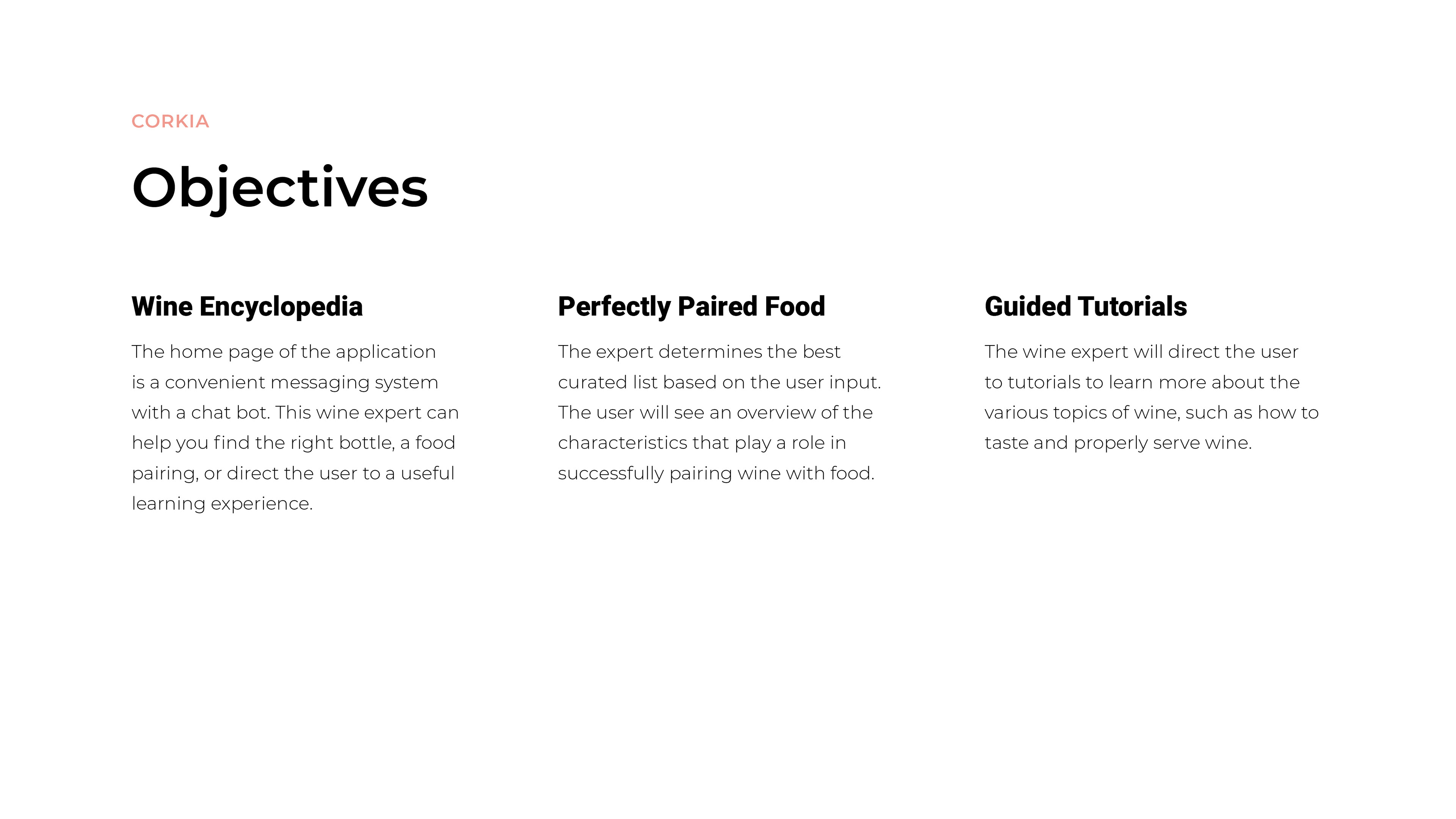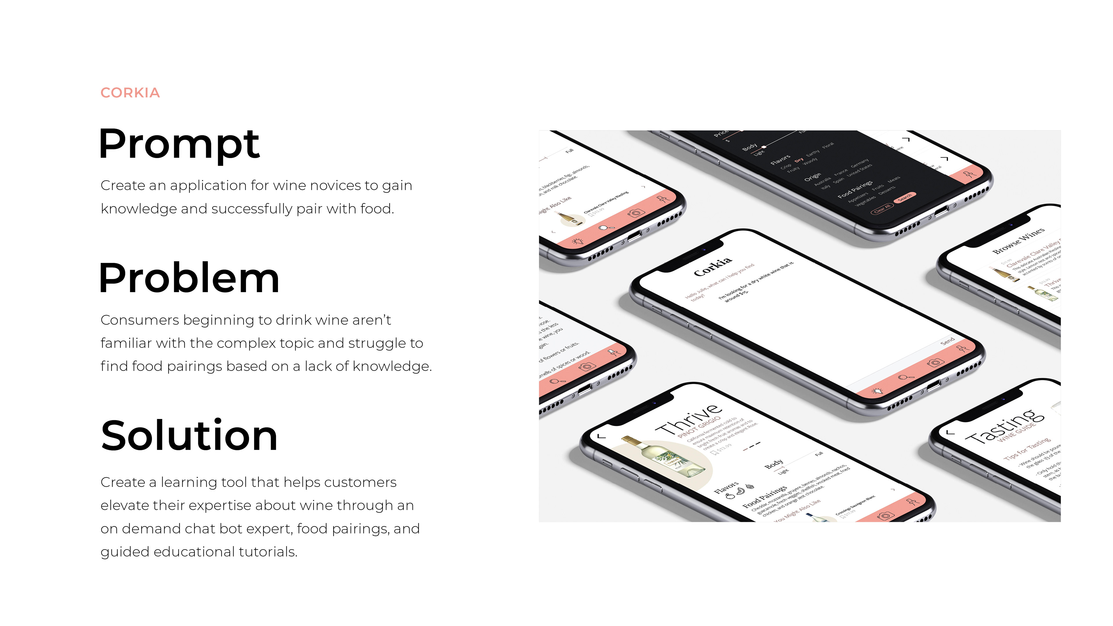 Corkia is a mobile application to gain knowledge about the various topics of wine. It's like having a personalized sommelier to chat with in your pocket!