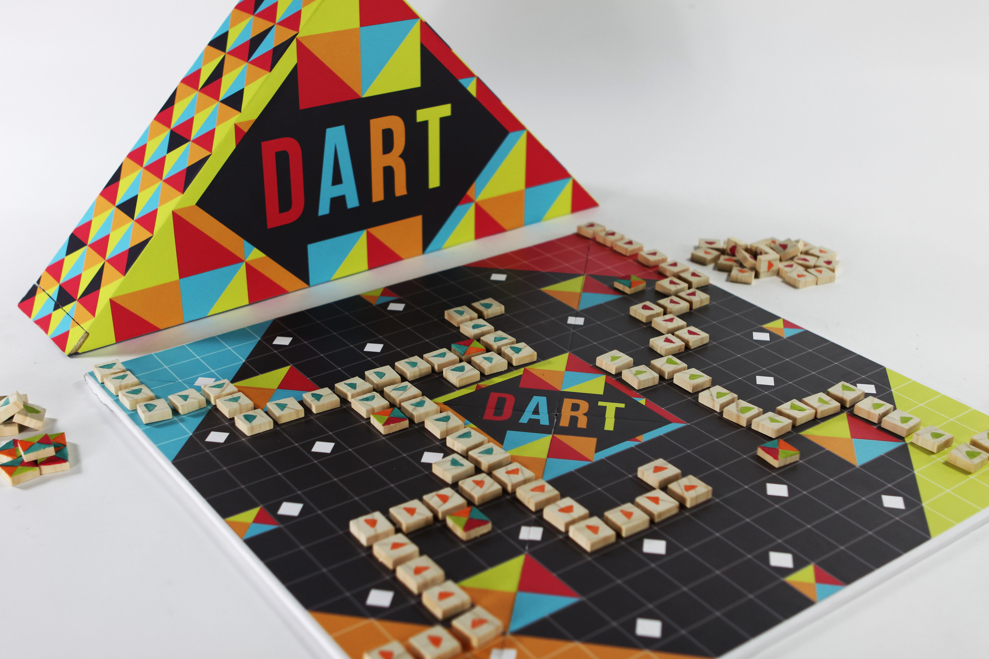 Dart is a strategy board game which includes the game board, instructions, 45 void tiles, 320 arrow tiles, and a deck of 60 dart cards within the box. The object of the game is to have the most colored tiles covering the board before you reach the opposite corner. The bright colors and originality in the packaging shape reflect the objective and design aesthetic of the overall game. Designed in a collaborative setting by Marie Fabozzi and Rachel Wright. I was responsible for the identity of the game including the logo, color palette, packaging graphics, and creation of the wooden game pieces.